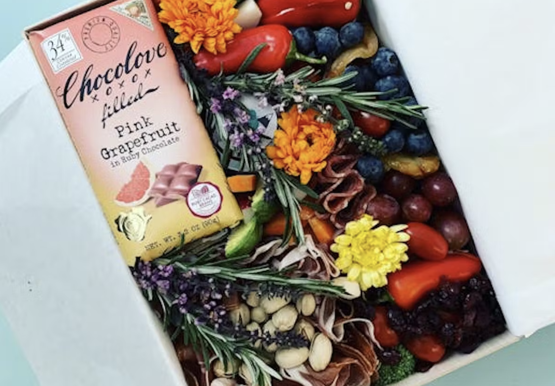 This Balsa wood box is ready for adventure! Filled with crackers, dip/spread, cheese, charcuterie, fresh fruit, fresh vegetables, dried fruit, olives or pickles, nuts, chocolate, garnished with fresh herbs and flowers.