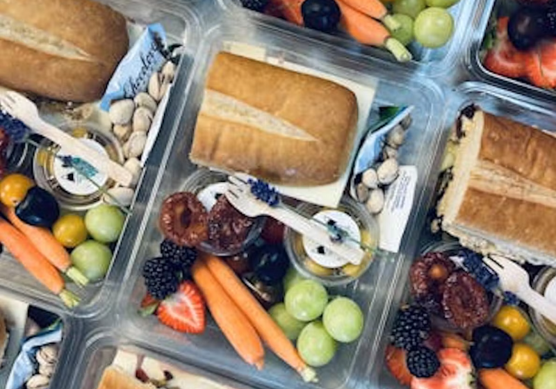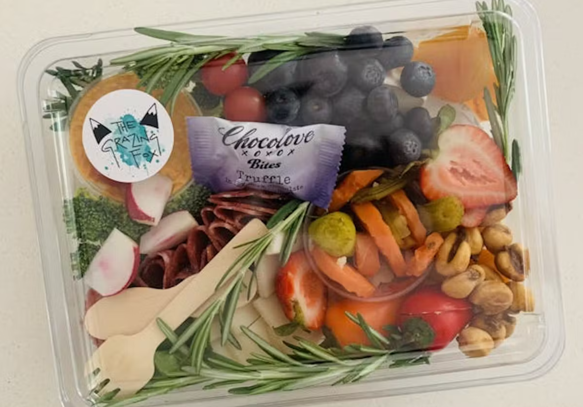 Individual, single-serve, ready to grab a cup of awesome. Includes crackers, 2 types of cheese, 1 type of charcuterie, pickles and/or olives, fresh veggies, fresh and dried fruit, nuts, chocolate, and herbs.